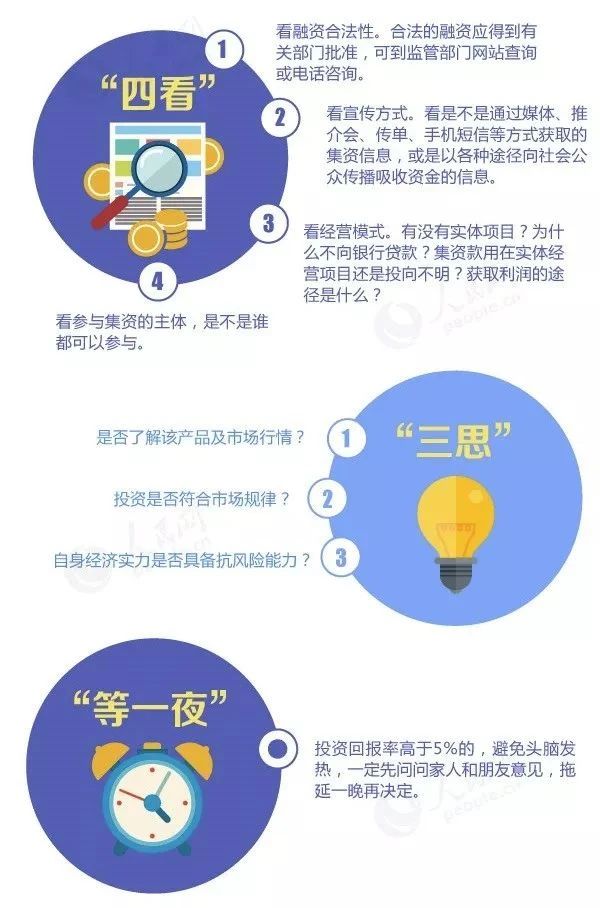 遇到投資集資類宣傳,一定要避免頭腦發(fā)熱,先征求家人和朋友意見,拖延一晚再?zèng)Q定,不要被高利誘惑盲目投資。